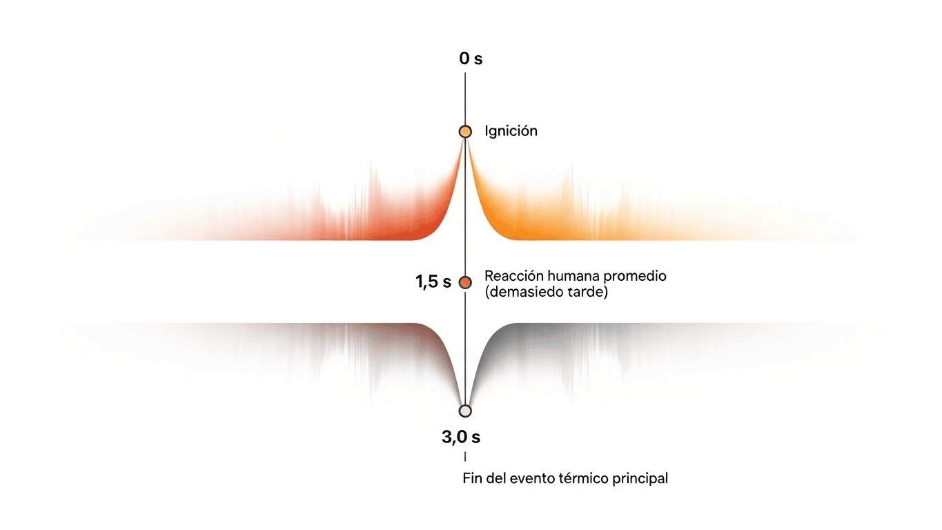 Cuando el cerebro logra comprender que el trabajador está envuelto en llamas, entre el 50% y el 70% del evento ya pasó. La velocidad supera de forma irreversible la capacidad de reacción. Por ello, El trabajador no puede escapar. La ropa ignífuga debe hacerlo por él. El EPP ignífugo en este escenario no es preventivo, sino una medida de supervivencia pasiva: debe activarse de manera inmediata, sin requerir decisión humana.